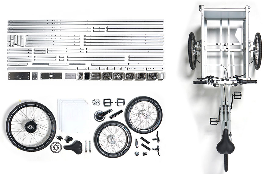 The frame consists of weather resistant, lightweight, standard aluminum tubes. Unlike the singular load-bearing tube seen in traditional bike structures, the main structure is an orthogonal spaceframe of standard aluminum tubes. A series of tubes of varying lengths are produced, holes are drilled and the frame is assembled using stainless steel bolts, washers and nuts. The assembling requires no welding process. Exposed ends of the tubes are capped with a standard PE plug to avoid sharp ends and to prevent dirt from accumulating inside the tubing. The construction makes it possible to place gear wheels and chains within the frame, away from the users. Instead of using ball bearings for steering parts plastic washers can be used. Whenever needed the tubes are reinforced by inserting POM or PE plugs to prevent the tubes from collapsing. All other mechanical parts, bicycle wheels etc. are standard parts that can be acquired all over the world.